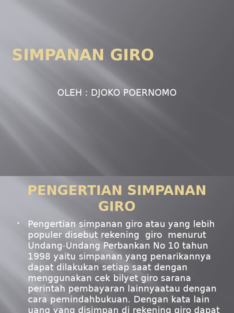 Pengertian simpanan giro merupakan simpanan pada bank yang penarikannya dapat dilakukan setiap saat. Hampir setiap orang pasti memiliki rekening simpanan di bank, namun tidak dengan giro dan deposito. Untuk penarikan tersebut, seperti nasabah pada umumnya, pemegang giro akan mendapatkan buku cek/bilyet giro sebagai bukti transaksi. Tabungan berjangka merupakan bentuk simpanan yang jangka waktu penarikannya telah ditentukan, misalnya setiap satu bulan, tiga bulan, enam bulan. Merubah ketentuan giro wajib minimum (gwm) menjadi 3%.